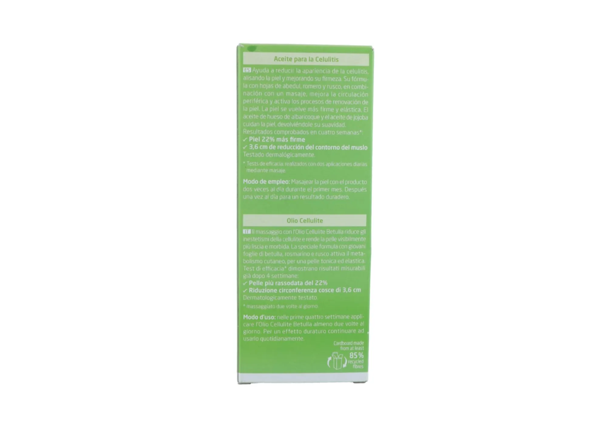 - Acción Anticelulítica: Ayuda a reducir visiblemente la apariencia de la celulitis existente.