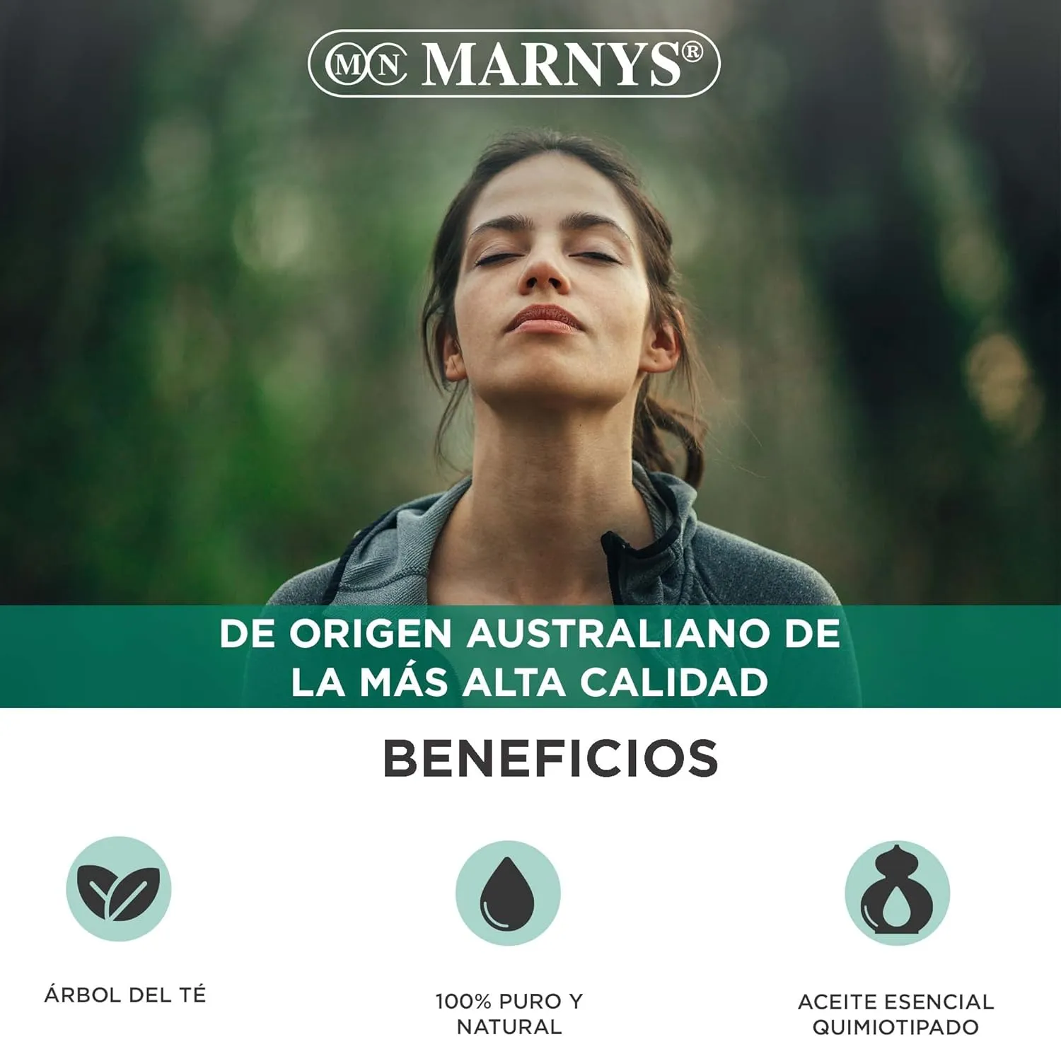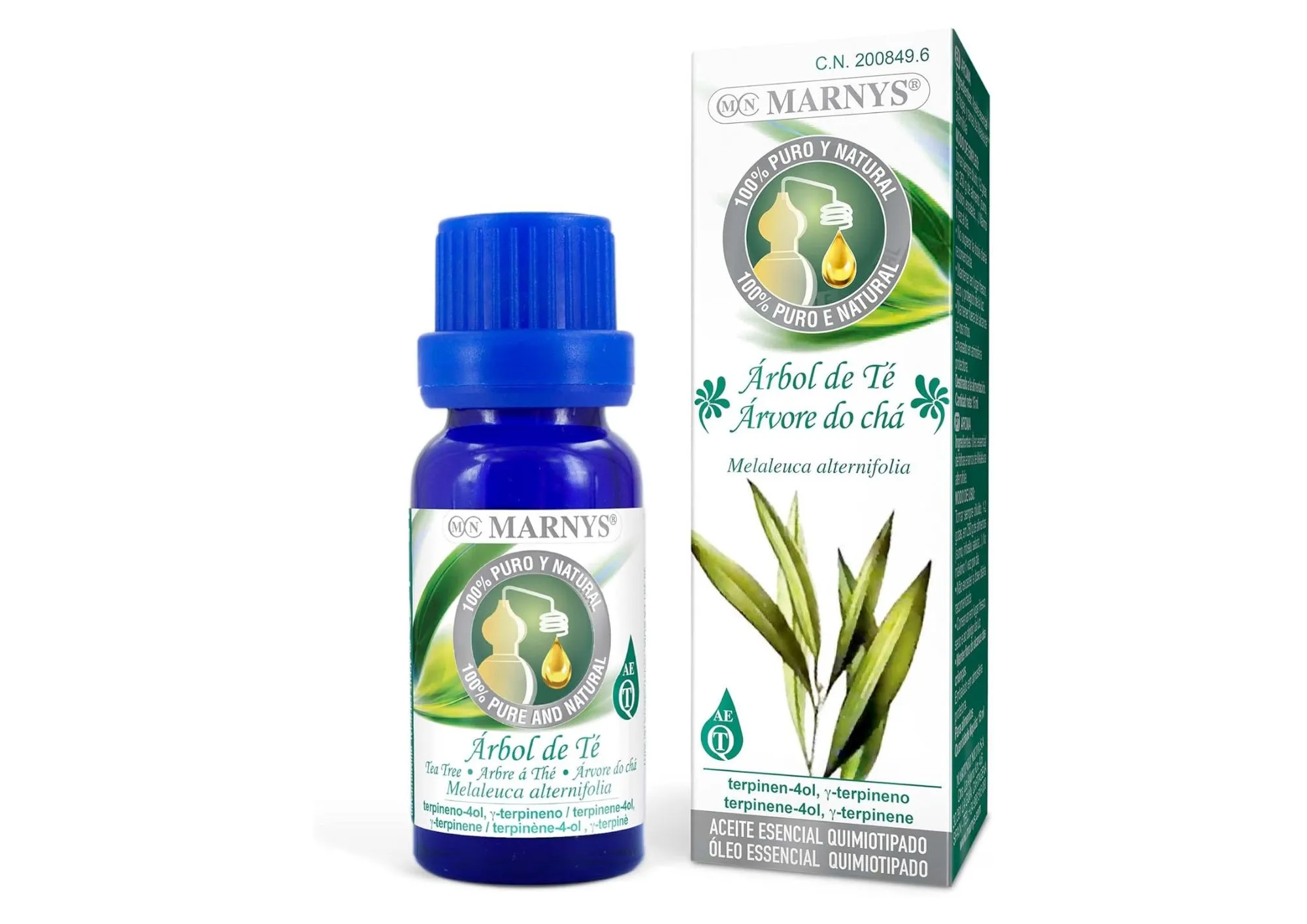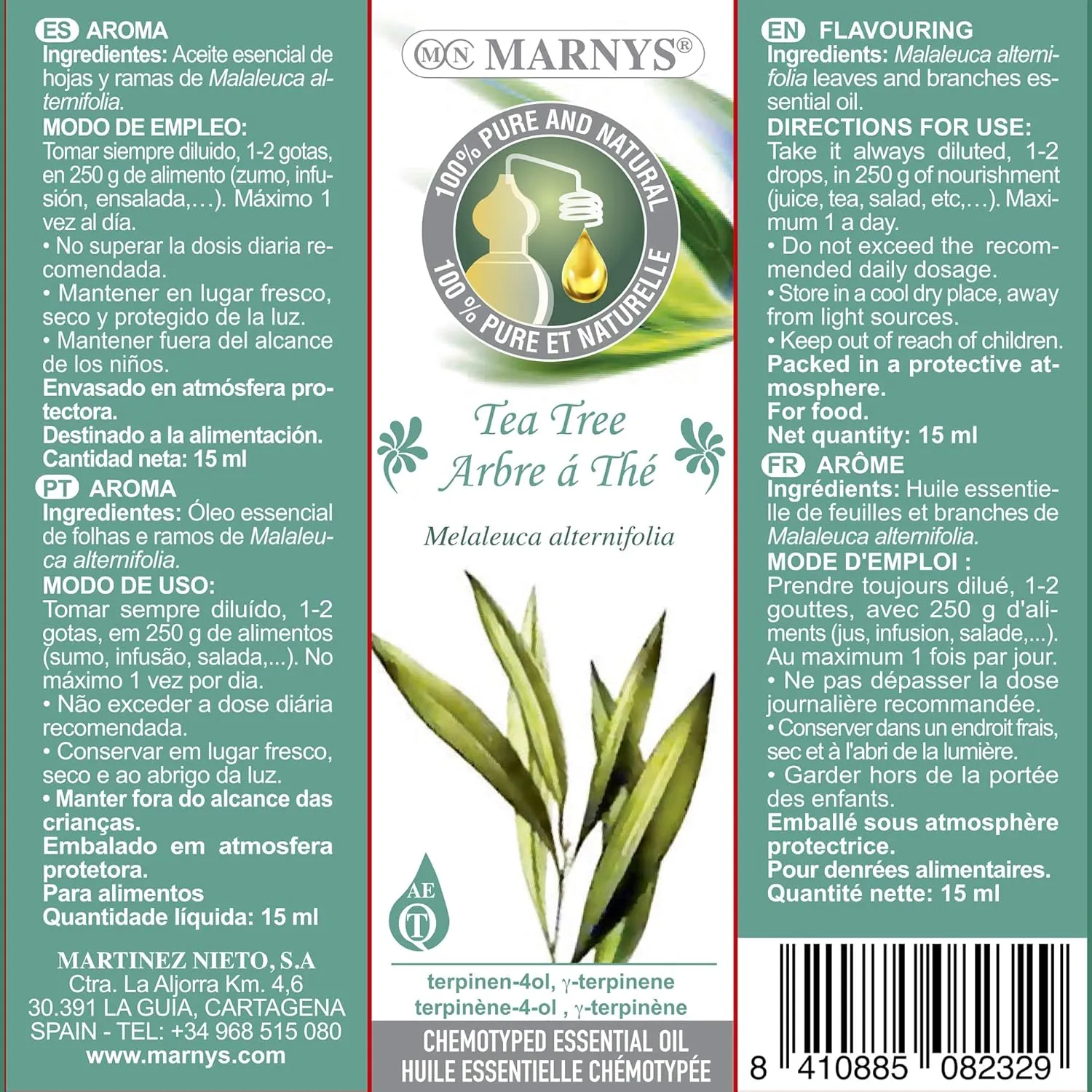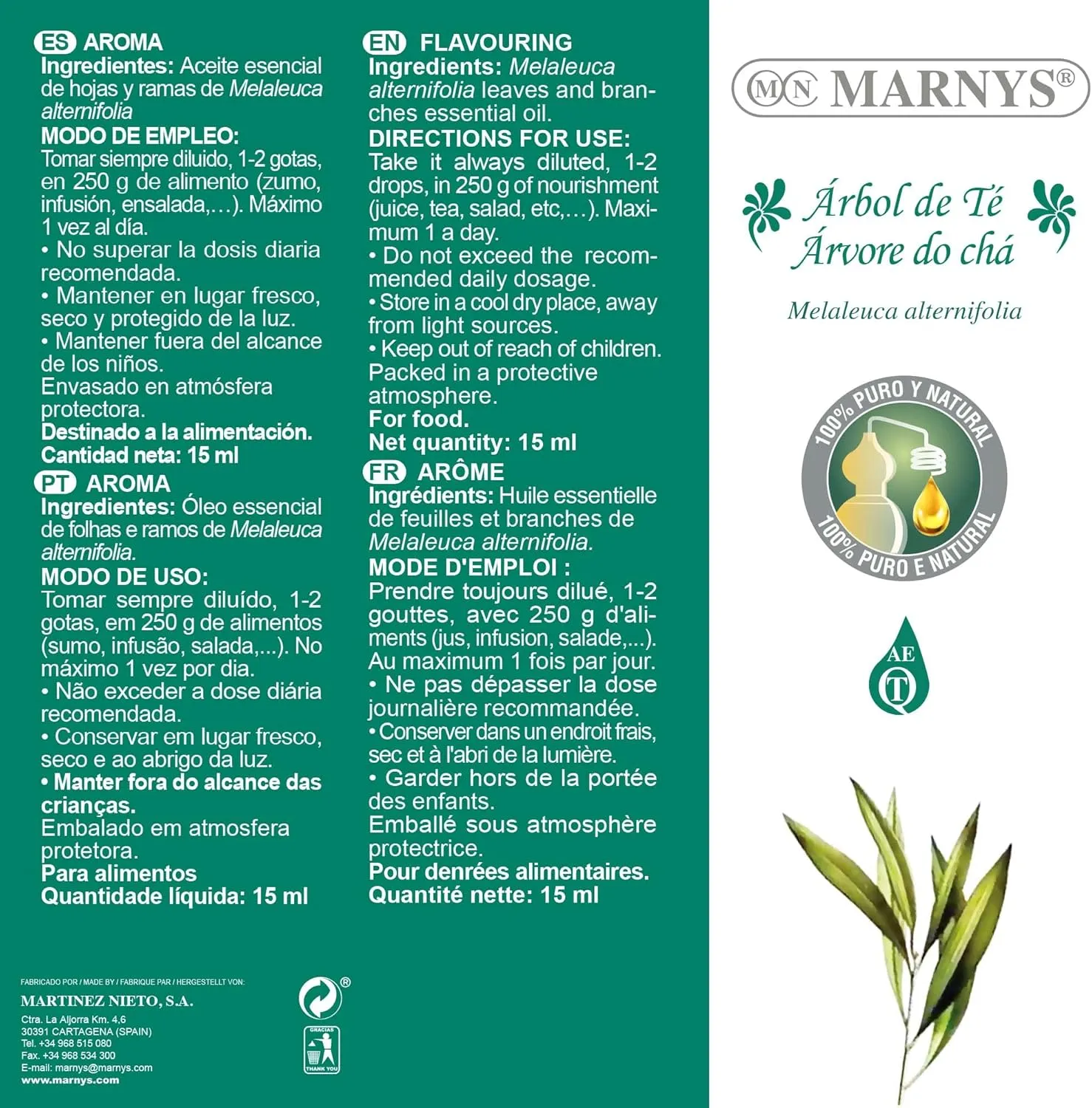 El MARNYS Aceite de Árbol de Té es un aceite esencial alimentario de origen australiano de la más alta calidad, puro y natural, obtenido sin utilizar productos químicos tóxicos ni semillas modificadas genéticamente. Contiene los quimiotipos: terpinene-4ol, γ-terpinene, destilado de sus hojas, su color es desde incoloro a suavemente amarillento, con sabor penetrante, herbáceo, alcanforado y acre, propiedades que favorecen el sabor alimentario.