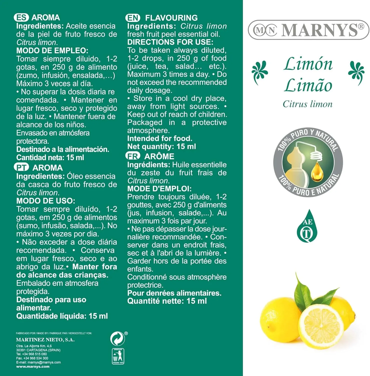 El Aceite Esencial de Limón de Marnys es obtenido por presión de la piel de fruto.