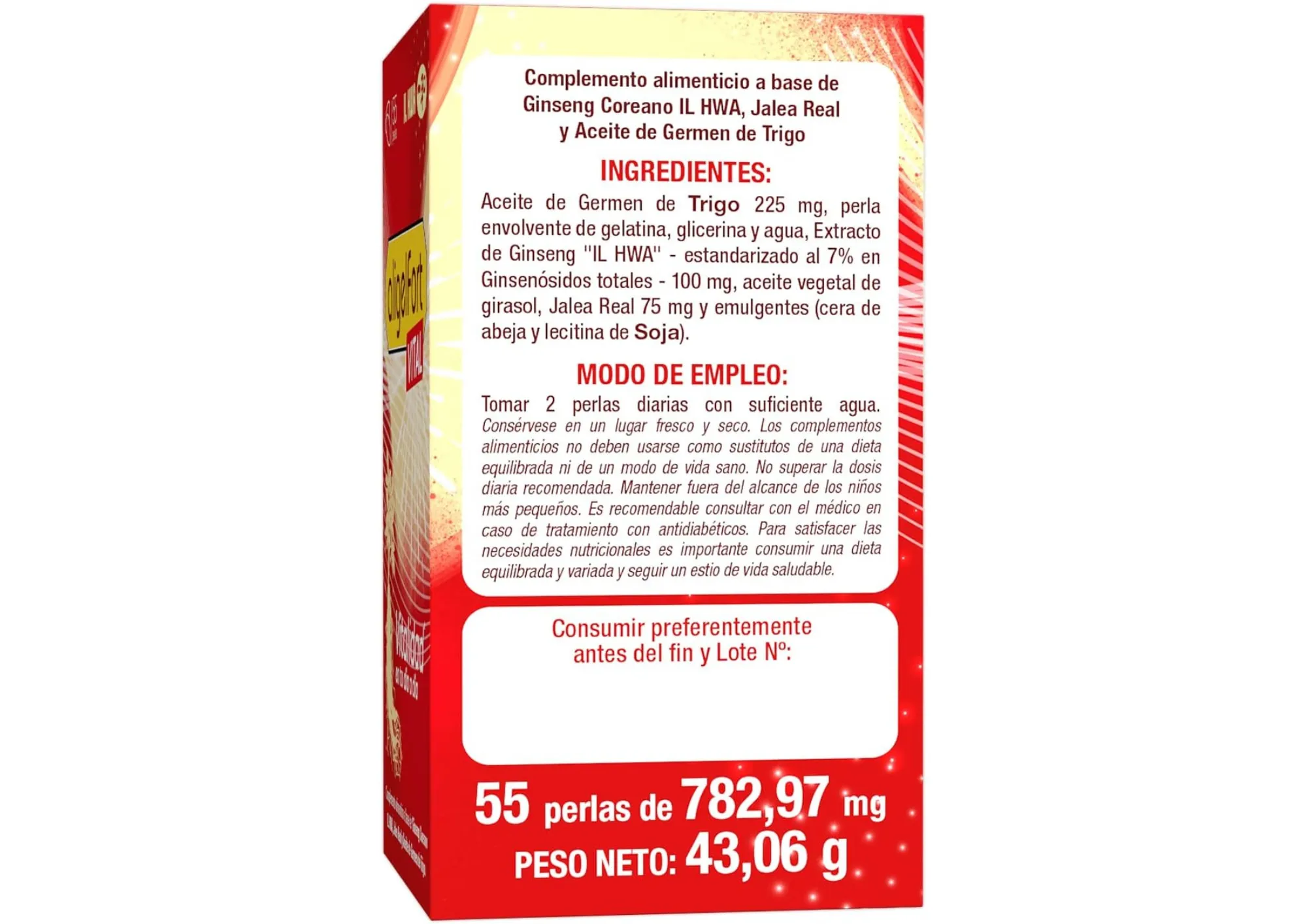 INGREDIENTES ACTIVOS (POR 2 PERLAS) Extracto Ginseng coreano IL HWA 200 mg (equivalente a 1000 mg de polvo de raíz) – Ginsenósidos totales 14 mg Jalea real 150 mg Aceite de germen de trigo 450 mg OTROS INGREDIENTES: Perla envolvente de gelatina, glicerina y agua, aceite vegetal de girasol, emulgentes (cera de abeja y lecitina de soja)