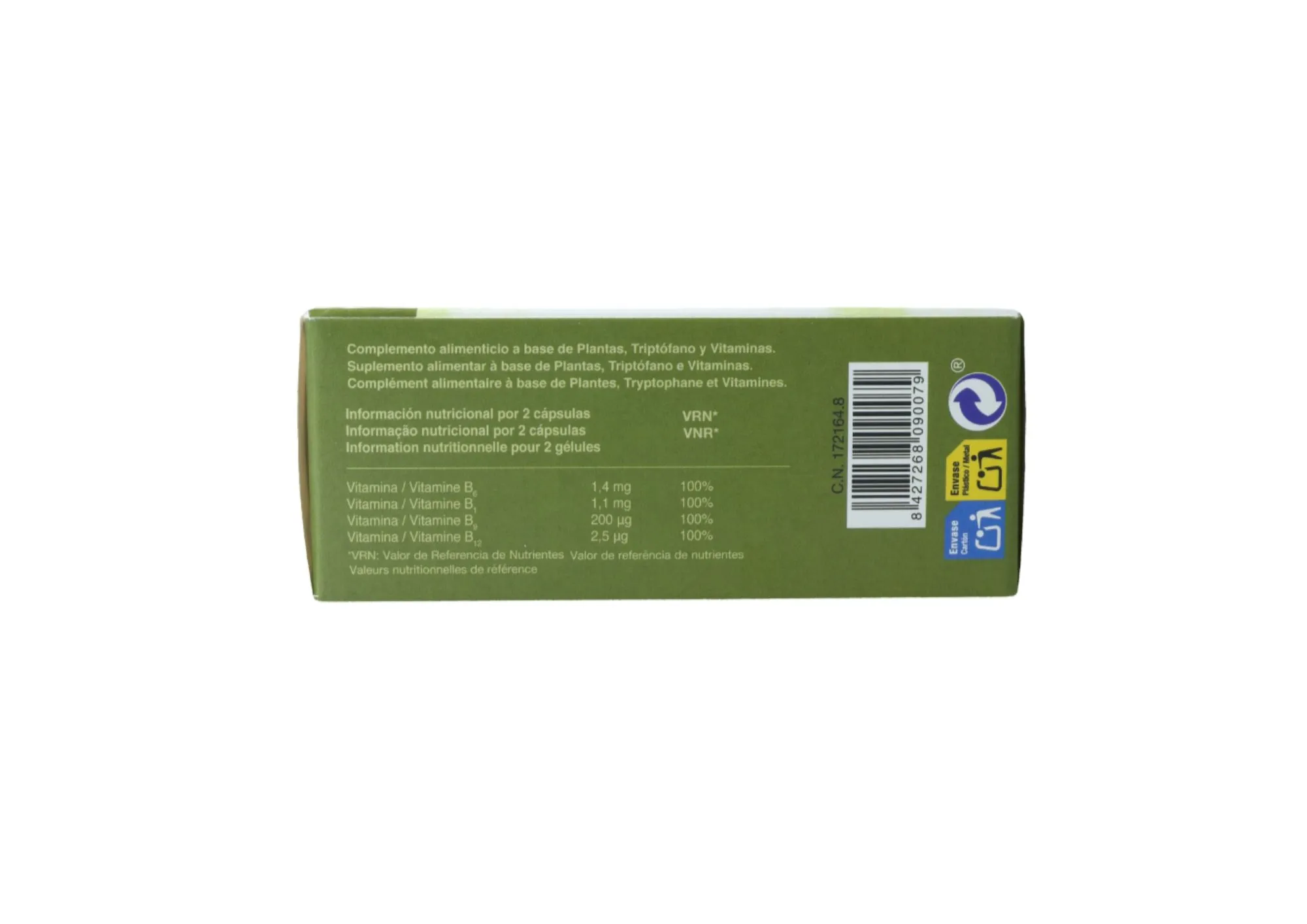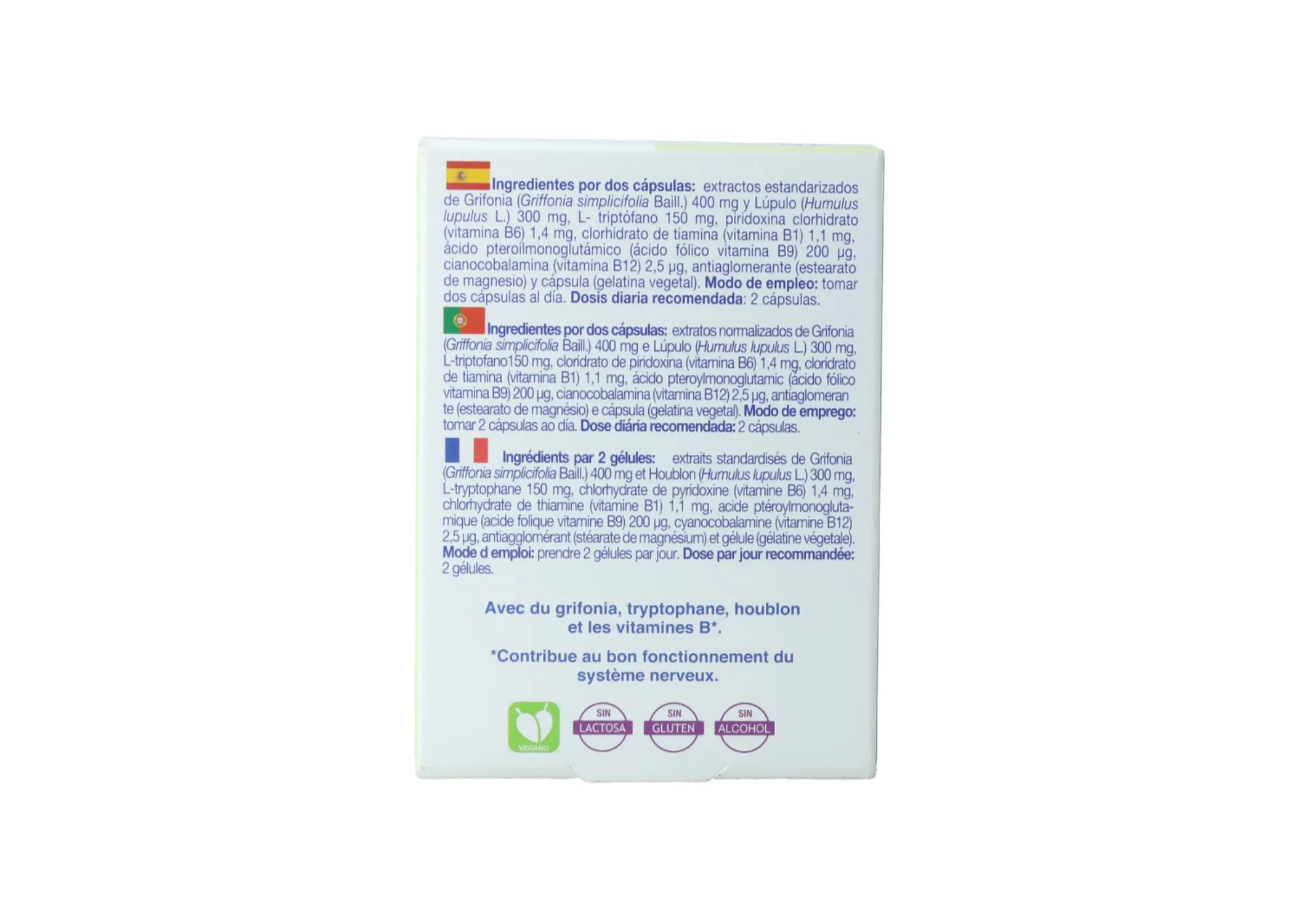 Extracto de griffonia, Extracto de lúpulo, L-triptófano, Vitamina B6, Vitamina B1, Vitamina B9, Vitamina B12, Cápsula, Gelatina vegetal.