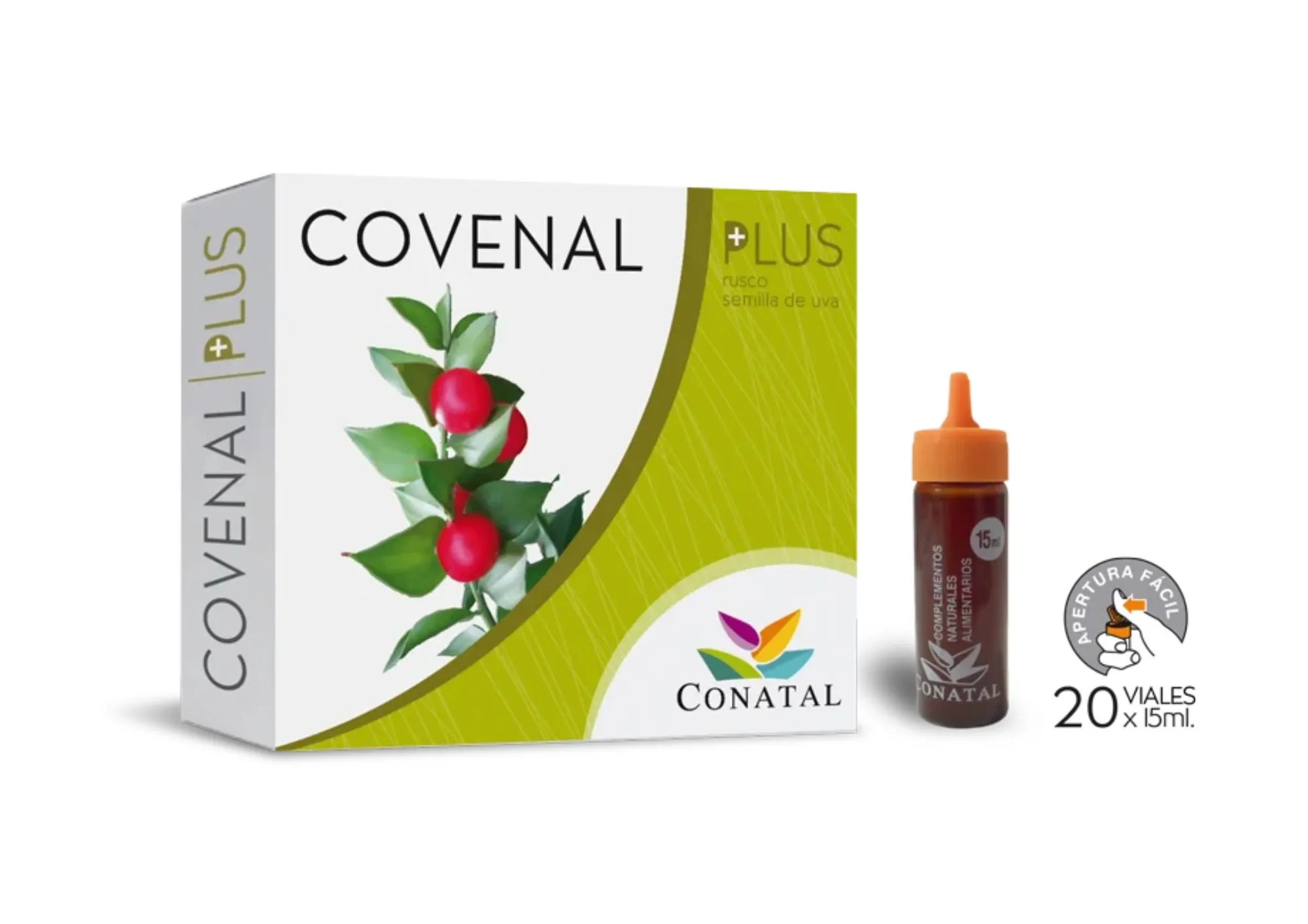 Covenal plus, apoyo al buen flujo sanguíneo de Conatal es un complemento alimenticio en forma de ampollas, formulado a base de Rusco y semilla de uva, comúnmente utilizadas por sus propiedades diuréticas y depurativas, que favorece el flujo sanguíneo, aliviando el cansancio y la pesadez de las piernas.