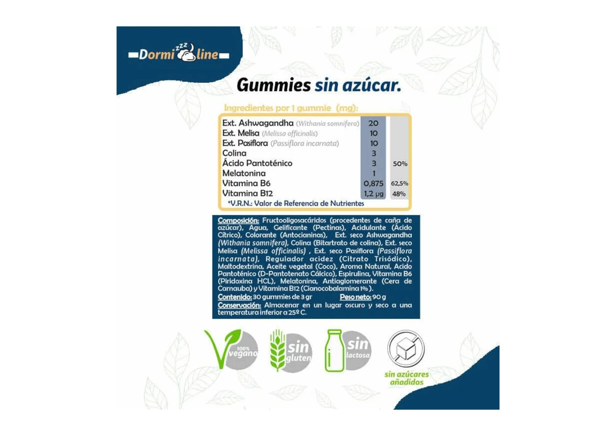 Gummies con extractos titulados de plantas, colina, vitaminas y la hormona del sueño, que contribuye a disminuir el tiempo necesario para conciliar el sueño.