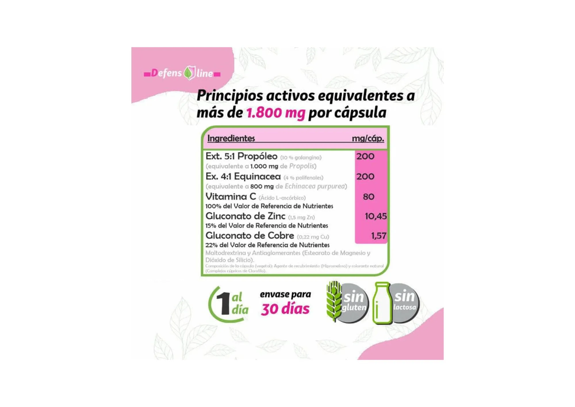Extracto de propóleo (200 mg) titulado al 10% en Galangina (20 mg), Propolis (1000 mg), Extracto de equinacea (200 mg) titulado al 4% en Polifenoles (8 mg), Equinacea (800 mg), Vitamina C (80 mg), Gluconato de zinc (10,45 mg), Zinc (1,5 mg), Gluconato de cobre (0,22 mg), Maltodextrina, Antiaglomerantes: estearato de magnesio y dióxido de silicio.