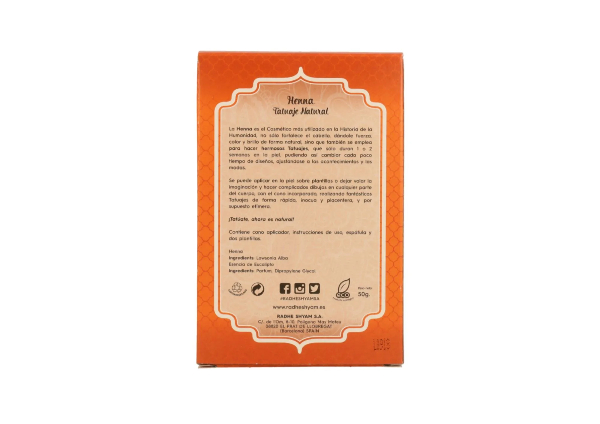 Se recomienda: 1.-Mezclar en un recipiente la Henna Radhe Shyam y 8 gotas de esencia de eucaliptus. Añadir agua hasta obtener una pasta cremosa. Colar la pasta para que sea mas liquida. Rellenar el cono y cerrarlo con cinta adhesiva. 2.-Frotar la zona a tatuar con un algodón empapado en esencia de eucaliptus Radhe Shyam y dejar secar 3.-Aplicar con el cono la pasta de Henna Radhe Shyam haciendo los dibujos que se deseen. Si se utiliza la plantilla, sujetarla sobre la parte del cuerpo a tatuar y aplicar la pasta con una espátula. Al cabo de 3 minutos retirar la plantilla. 4.- Dejar secar la Henna y, pasados 30 minutos, aplicar con un algodón empapado en una mezcla de zumo de limón y 2 cucharadas de azúcar. Dejar secar durante 2 o 3 horas, aunque lo ideal es dejarlo toda la noche. Rascar la pasta con una espátula. La exposición a una fuente de calor aumentará la profundidad. Al día siguiente, la tonalidad será más intensa.