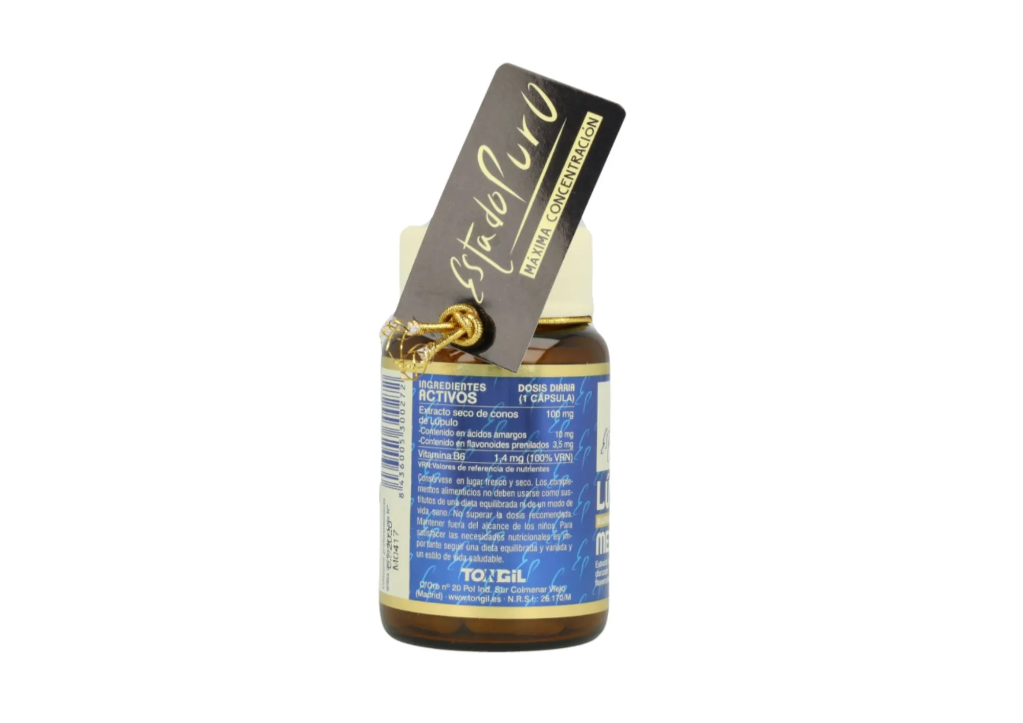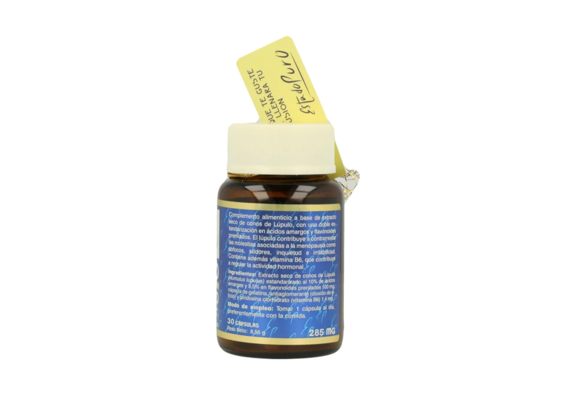 Cada cápsula aporta 100 mg de extracto seco de conos (inflorescencias) de Lúpulo. La estandarización garantiza el aporte por cápsula de 10 mg de ácidos amargos y 3,5 mg de flavonoides prenilados, convirtiéndolo en el ingrediente más completo con una doble actividad.
