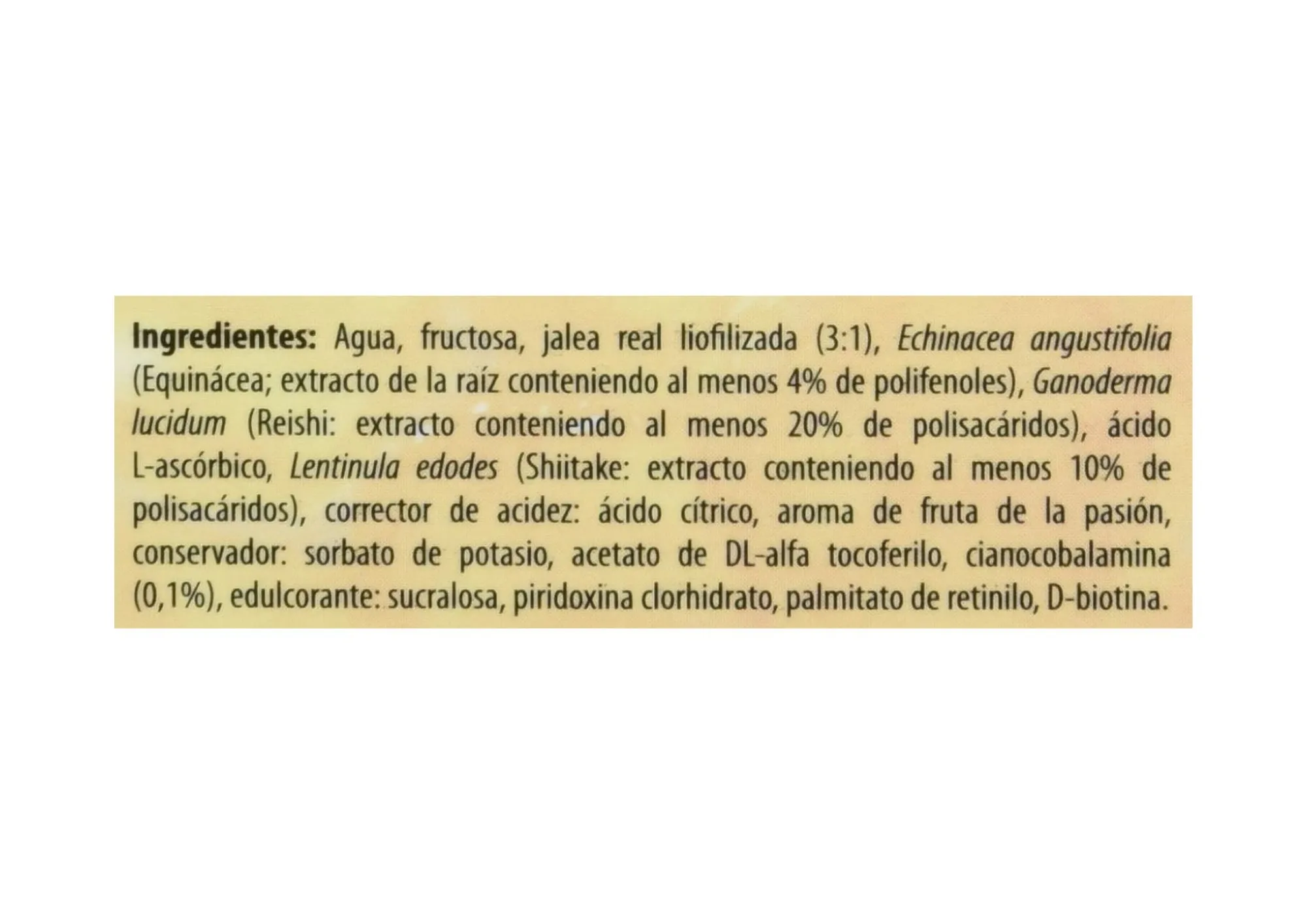 Agua, fructosa, jalea real liofilizada (3:1) conteniendo al menos 4% de HDA, Echinacea angustifolia (Equinácea; extracto de la raíz conteniendo al menos 4% de polifenoles), Ganoderma lucidum (Reishi: extracto conteniendo al menos 20% de polisacáridos), ácido L-ascórbico, Lentinula edodes (Shiitake: extracto conteniendo al menos 10% de polisacáridos), corrector de acidez: ácido cítrico, aroma de fruta de la pasión, conservador: sorbato de potasio, acetato de DL-alfa tocoferilo, cianocobalamina (0,1%), edulcorante: sucralosa, piridoxina clorhidrato, palmitato de retinilo, D-biotina.
