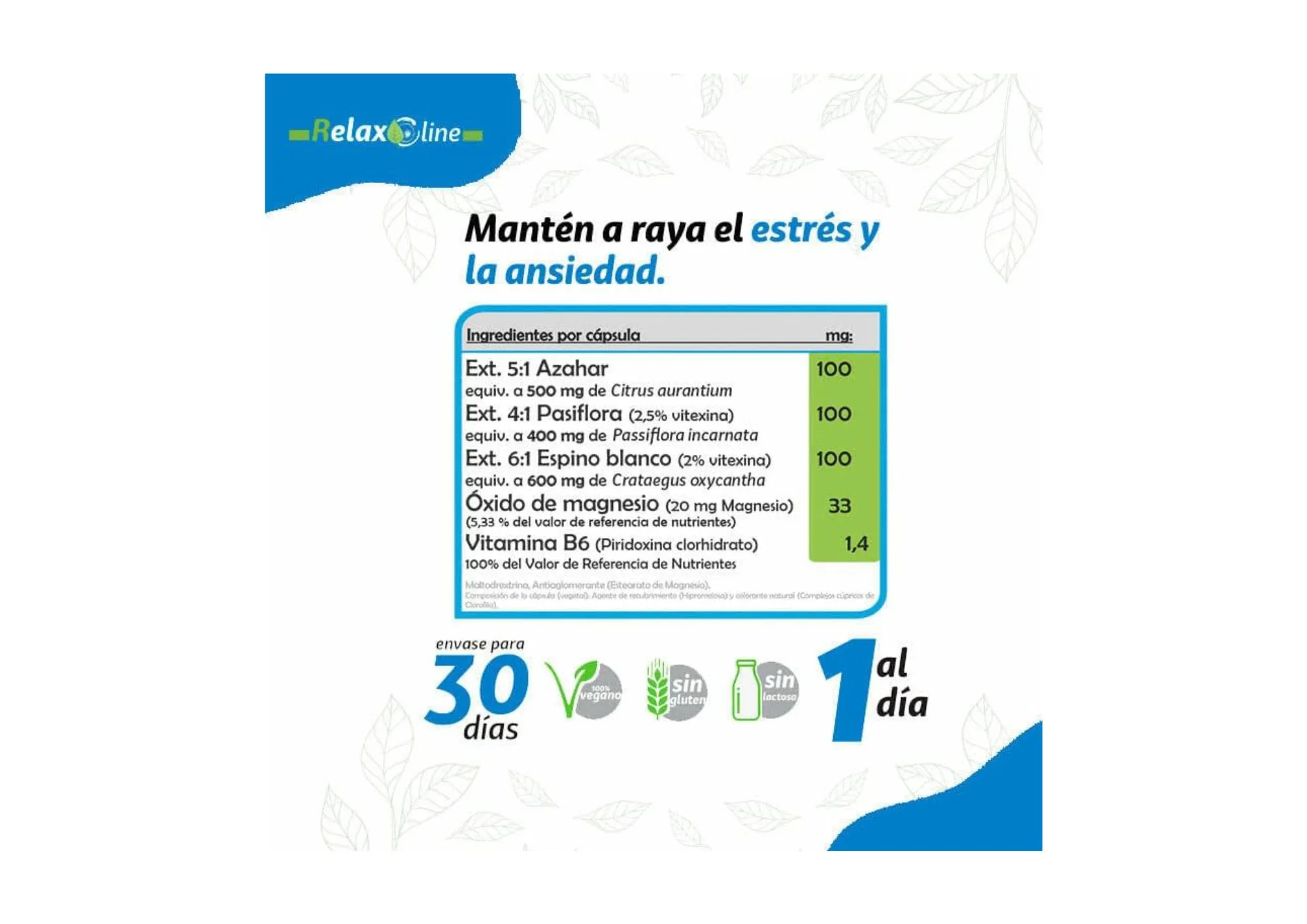Crataegus oxycanta (600 mg), Citrus aurantum (500 mg), Passiflora incarnata (400 mg), Extracto de pasiflora (100 mg), Extracto de Espino Blanco (100 mg), Extracto de azahar (100 mg), Magnesio (20 mg), Vitamina B6 (1.4 mg).